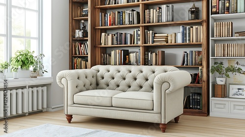 sofa, cream, elegant, room, reading, book, bookshelf, library, wooden, shelf, bookshelf, home, interior, design, decor, furniture, comfortable, cosy, tufted, beige, classic, traditional, vintage, style, aesthetic, light, bright, window, plant, potted, floor, wood, white, radiator, rug, rustic, warm, lighting, peaceful, serene, quiet, relaxing, stylish, apartment