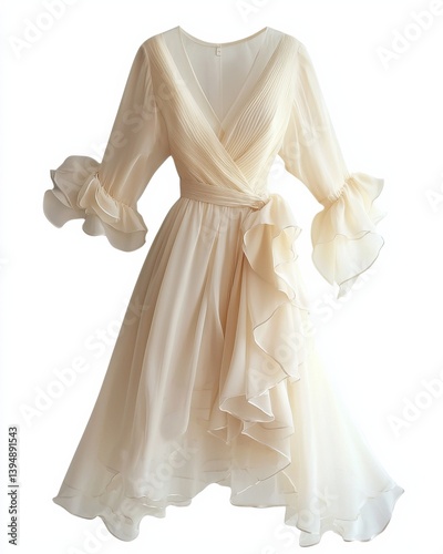 dress, cream, sleeve, ruffle, elegant, fashion, clothing, style, fabric, chiffon, enclosed, attaching, waist, neckline, formal, occasion, apparel, outfit, white, display, flowing, detail