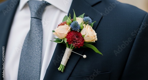 Elegant dark navy suit with a vibrant floral boutonniere featuring red and cream roses with blue thistles, concept for wedding day attire, formal event styling and sophisticated groom presentation