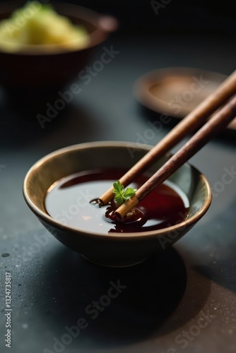 Elegant dark wood chopsticks beside a ceramic soy sauce dish , soy sauce, side view