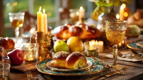 Elegant dinner setting with fresh fruits, pastries, and warm candles creating a cozy atmosphere during a festive gathering