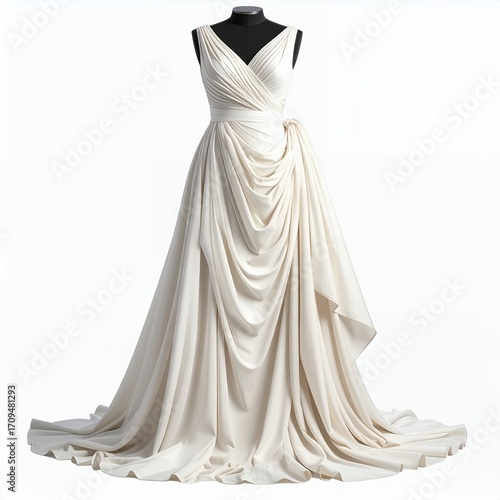 Elegant draped white dress on mannequin, floating against a pristine white background