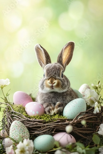Elegant Easter flyer with a bunny in a rustic nest, soft floral highlights, and painted eggs