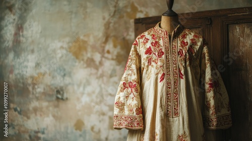 Elegant Embroidered Garment Displayed on a Mannequin Against a Textured Vintage Wall, Showcasing Intricate Floral Patterns and Craftsmanship in Fashion Design