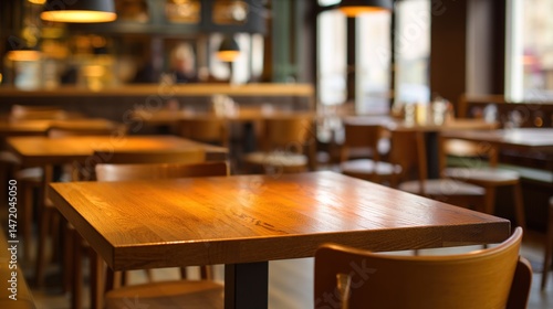 Elegant empty restaurant interior with polished wooden tables and chairs, showcasing potential dining space for business expansion or grand opening concept.