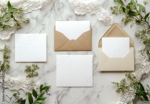 Elegant Flat Lay of Blank Envelopes and Cards Surrounded by Delicate Lace and Greenery on Marble Background for Creative Projects and Invitations