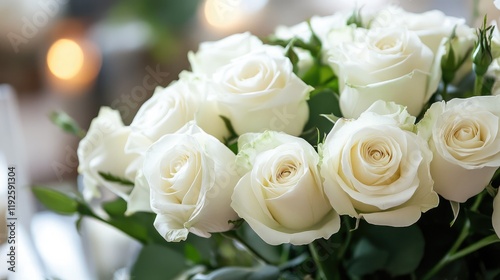 Elegant floral arrangement featuring pristine white roses surrounded by lush greenery and softly glowing background lights.