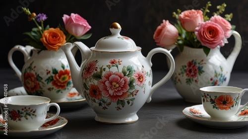 Elegant floral tea set with roses and ranunculus.