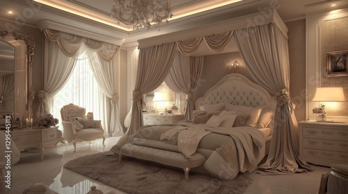 bedchamber, girl, elegant, interior, design, canopy, bed, curtain, luxurious, furniture, gold, beige, white, decor, room, princess, royals, sophisticated, stylish, charming, comfort, ornate, bedding, pillow, cushion, headboard, dresser, chair, mirror, lamp, table, rug, floor, window, light, classic, romantic, opulent, detail, texture, roomy, peaceful