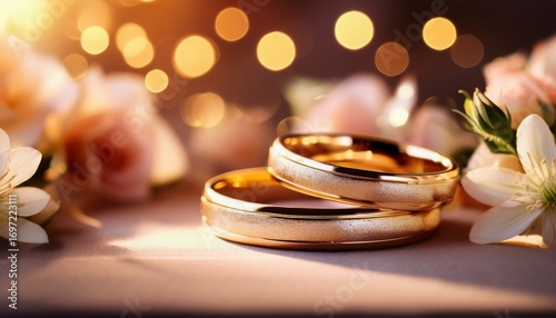elegant gold wedding rings displayed with soft floral background and glowing lights