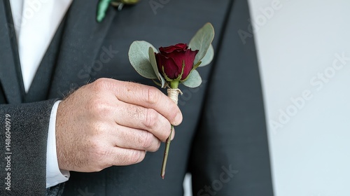 Elegant Groom Holding Red Rose Boutonniere with Greenery Detail