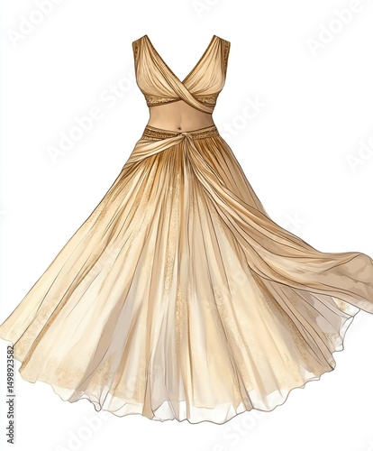 Elegant hand drawn illustration of a flowing beige two piece formal gown perfect for fashion design