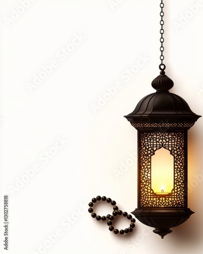 Elegant Hanging Lantern and Prayer Beads with Warm Candlelight on White Background