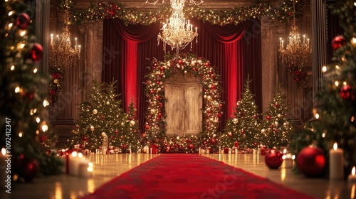 Elegant holiday setting with festive decorations, lush evergreen trees, red curtains, twinkling lights, and a grand chandelier creating a magical ambiance.