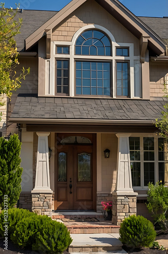 Elegant Home Exterior with Stone Accents and Classic Design. This stunning house features a beautiful facade, grand entrance, and meticulous landscaping, creating a luxurious and inviting atmosphere.