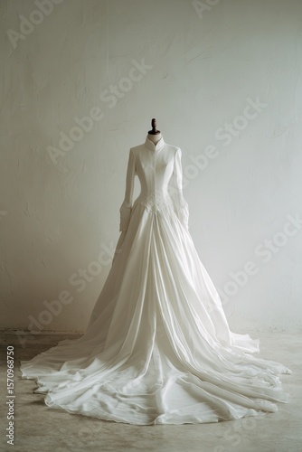 gown, dress, wedding, bridal, ivory, white, elegant, classic, fitted, bodice, mannequin, studio, background, neutral, simple, sophisticated, romantic, timeless, fashion, sewing, design, dressmaker, fabric, silk, satin, texture, drape, flow, train, skirt, sleeve, cuff, collar, detail, beauty, grace, poise, style, formal, ceremony, celebration, apparel, attire, garment, outfit, look