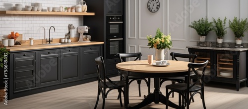 Elegant kitchen setup with a round wooden dining table, chair, black cabinet counter, cupboard, stove, sink, and oven in natural light for stylish interior design, cooking, and dining setting.