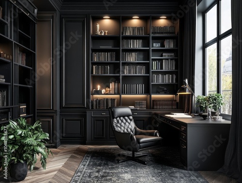 Elegant library with black walls and dark grey shelving