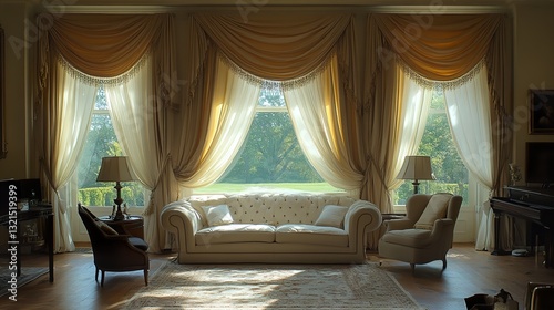 window, curtain, sofa, armchair, interior, design, room, elegant, luxury, classic, home, house, decor, furniture, living, space, style, architecture, building, residential, daylight, sunlight, view, landscape, garden, tree, floor, rug, comfort, rich, grand, estate, luxury home, tapestry, drape, ornate, refined, opulence, serene, tranquil, peaceful, calm, bright, airy, roomy
