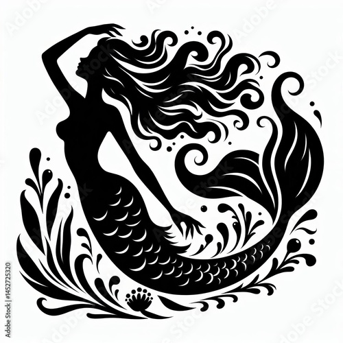 mermaid, silhouette, vector, illustration, design, graphic, mythical, fantasy, sea, ocean, creature, woman, beautiful, elegant, magic, tale, legend, mythology, aquatic, underwater, image, picture, photo, photo, symbol, line art, vignetting