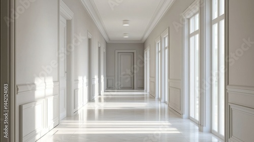 Elegant Minimalist Corridor with Abundant Natural Light and Empty Doors