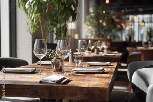 Elegant modern restaurant interior with neatly set tables, glassware, and soft natural light, creating a cozy and sophisticated dining atmosphere.