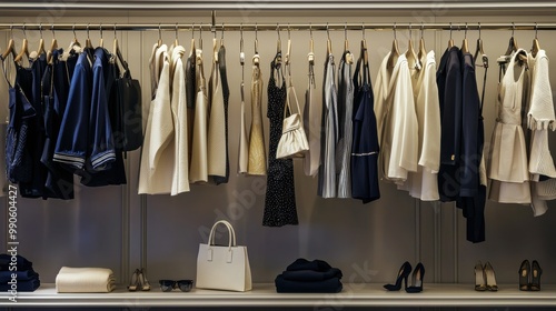 fashion, clothing, apparel, retail, shopping, clothes rack, closet, hanger, display, collection, style, design, texture, material, monochrome, minimalist, modern, elegant, sophisticated, luxury, brand, sewing, ensemble, outfit, accessory