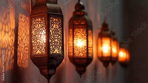 elegant moroccan lanterns: explore the intricate metalwork and ambient lighting of traditional wall-mounted islamic decorations, casting ornate shadow patterns and a warm glow at festivals