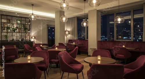 bar, interior, night, evening, eatery, lounge, seating, chair, table, round, velvet, plush, elegant, sophisticated, luxurious, modern, contemporary, design, architecture, lighting, dim, warm, glow, ambience, atmosphere, city, view, window, glasses, city landscape, urban, dark, moody, relaxing, calm, empty, nobody, indoor, inside, decor, style, furniture, globe, fixture
