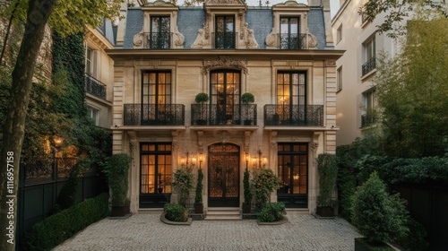 house, building, architecture, paris, france, facades, row house, home, elegant, luxury, residential, exterior, city, stone, window, door, balcony, landscaping, garden, plant, tree, evening, dusk, light, ornate, detail, classic, traditional, style, design, real estate, property, apartment, dwelling, structure, urban, metropolitan, luxury home, estate, residence, streetscape