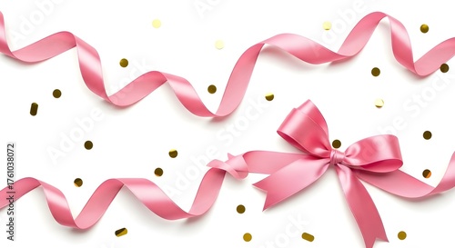 Elegant pink satin ribbon curves with decorative bow and gold confetti on white background