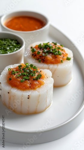 Elegant plate of minimalist seafood tartare trio garnished with delicate sauces beautifully arranged for gourmet dining