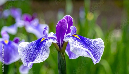 Elegant purple and white iris flowers blooming in a Japanese garden, with stone path