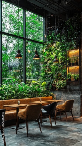Elegant restaurant interior featuring lush greenery, cozy seating, and large windows for natural light.