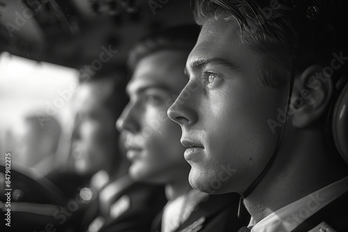 Elegant shot of a pilot and co-pilot in the cockpit, with a minimalist instrument panel,
