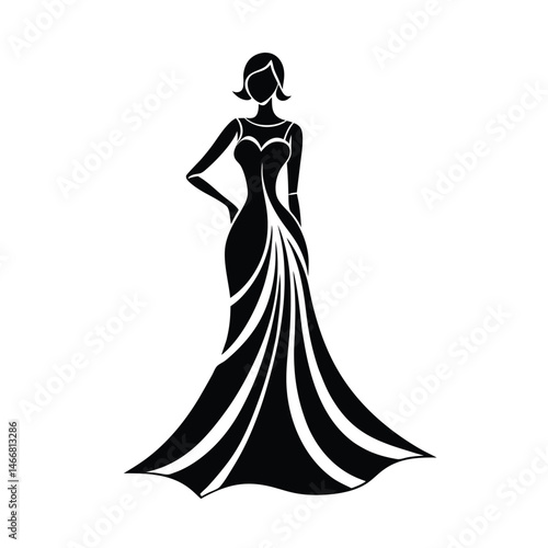 woman, silhouette, dress, gown, elegant, fashion, design, vector, black, white, art, illustration, female, model, stylish, beauty, chic, glamour, formal, prom, evening, party, attire, figure, sophisticated, outline, graceful, minimalist, graphic, template, abstract, logotype, icon, isolated