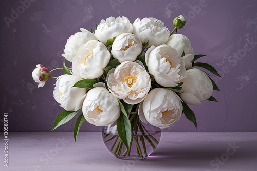 Elegant Soft White Peonies Floral Arrangement on Muted Lavender Background for a Romantic Spring Aesthetic