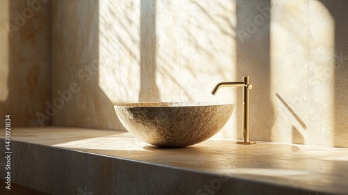 sink, bathroom, sunlight, stone, faucet, elegant, interior, design, home, decor, modern, luxury, natural, water, laundered, basin, style, aesthetic, architecture, clean, minimalist, warm, light, texture, contemporary, space, renovation, comfort, chic, soothing, ambience, relaxing, fixture, artistry, craftsmanship, serene, tranquil, beauty, detail, polished, environment, material, functional, unique, atmosphere, harmony, attracted, inspiration, lifestyle