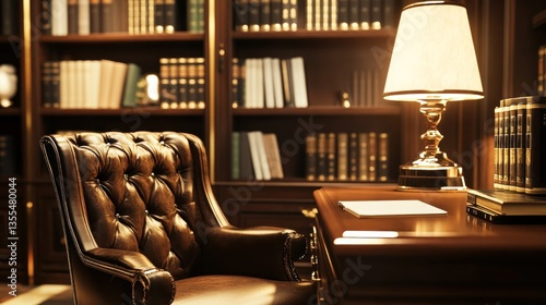 Elegant Study Room with Leather Chair and Bookshelves Warm Lighting for Cozy Reading or Work S