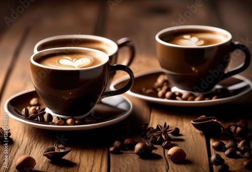 elegant stylish coffee cups artfully arranged warm wooden surface home cafe ambiance, artisanal, beverage, black, mug, ceramic, charming, chic, colorful