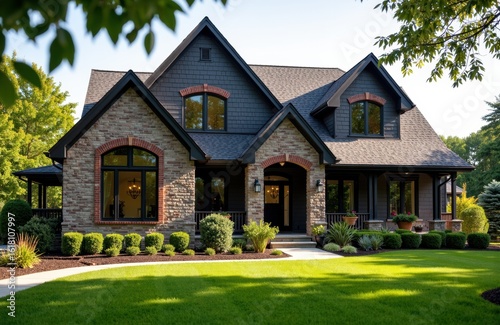 Elegant suburban house with brick and dark siding exterior surrounded by lush green lawn and landscaped garden