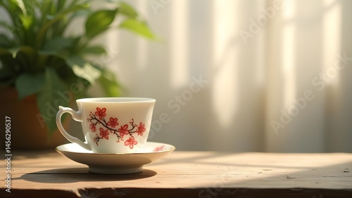Elegant Tea Cup with Floral Design on Wooden Table in Sunlight