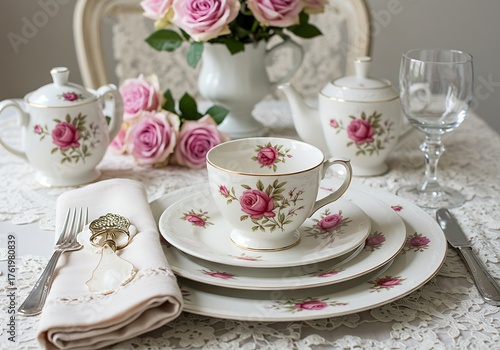 tea, party, setting, table, china, floral, rose, pink, vintage, elegant, teacup, teapot, saucer, plate, napkin, fork, knife, glasses, vase, lace, tablecloth, decoration, event, celebration, afternoon, drink, beverage, porcelain, crockery, cutlery, stemware, bouquet, blossom, arrangement, traditional, classic, romantic, delicate, fancy, home, interior, lifestyle, still, life, indoor, luxury, hostess, gathering