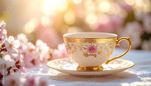 Elegant teacup with floral design amidst blossoms in soft sunlight