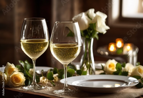 elegant trendy wine glasses showcasing poured white wine stylish ambiance soft lighting decorative elements, drink, beverage, table, design, party, celebration