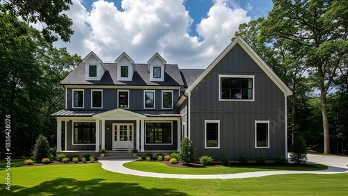 house, home, exterior, architecture, residential, building, property, real estate, yard, lawn, grass, tree, landscaping, dormer, window, shutter, entrance, door, paseo, path, cloud, sky, daytime, outdoors, modern, traditional, design, style, facades, structure, residence, estate, luxury, upscale, suburban, neighbourhood, american, north america, two-story, garden, green