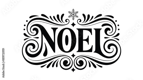 Elegant vintage decorative flourish frame surrounding the word noel with a snowflake accent in a classic silhouette style