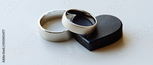 Elegant wedding bands resting on a black heart-shaped wooden base symbolizing eternal love