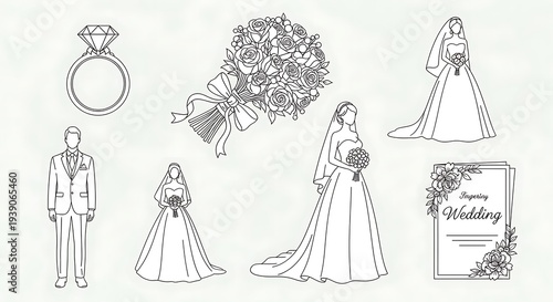 wedding, bride, groom, ring, bouquet, ceremony, dress, love, marriage, couple, celebration, flower, rose, elegant, outline, vector, illustration, design, graphic, art, white, background, minimalist, style, drawing, vignetting, template, invitation, card, event, holiday, human relationships, together, happiness, romance, party, decoration, isolated, symbol, floral, silhouette