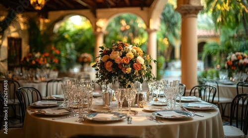 Elegant wedding reception table setting, outdoor patio, lush garden background, event decor